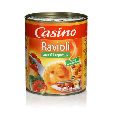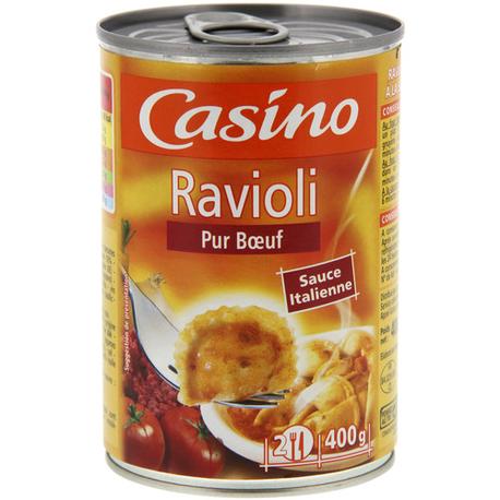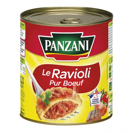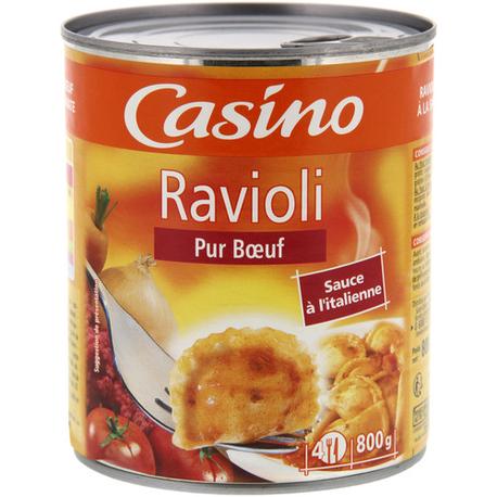 Ravioli Pur Boeuf.Ingrédients : SAUCE : eau, concentré de tomate 6 %, légumes (oignons, carottes), viande de bœuf, huile de colza, sel , sucre, amidon...