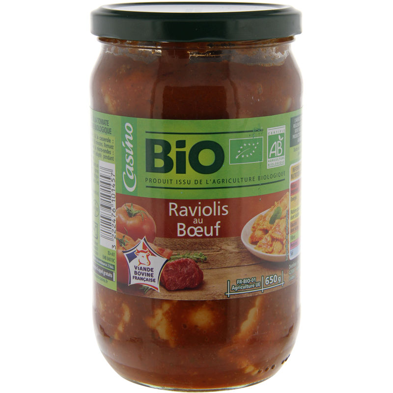 Ravioli au boeuf et à la tomate issus de l'agriculture biologique.Ingrédients : Eau - ravioli* 21.5% [semoule de _blé_ dur* - eau - viande de...