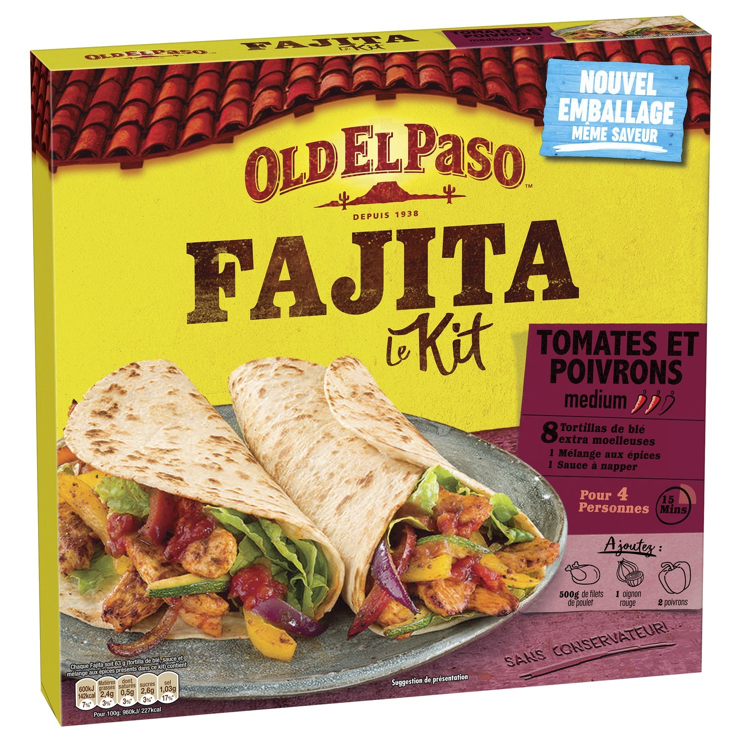 Kit pour fajitas tomates et poivrons, medium.Ingrédients : Tortillas de blé extra moelleuses (65%) : Farine de _blé_, eau, glycérol, huile de tournesol, mono -...
