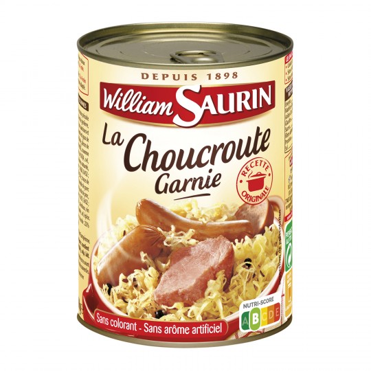 Choucroute garnie supérieure au vin blanc. Ingrédients : Choucroute 46% - viande de porc traitée en salaison et précuite 13,5% (viande de porc - eau...