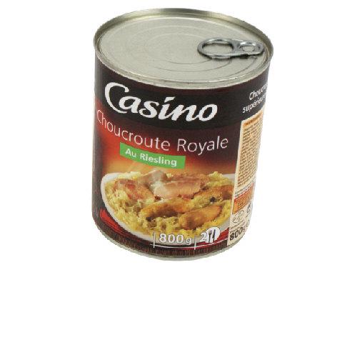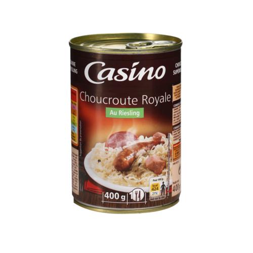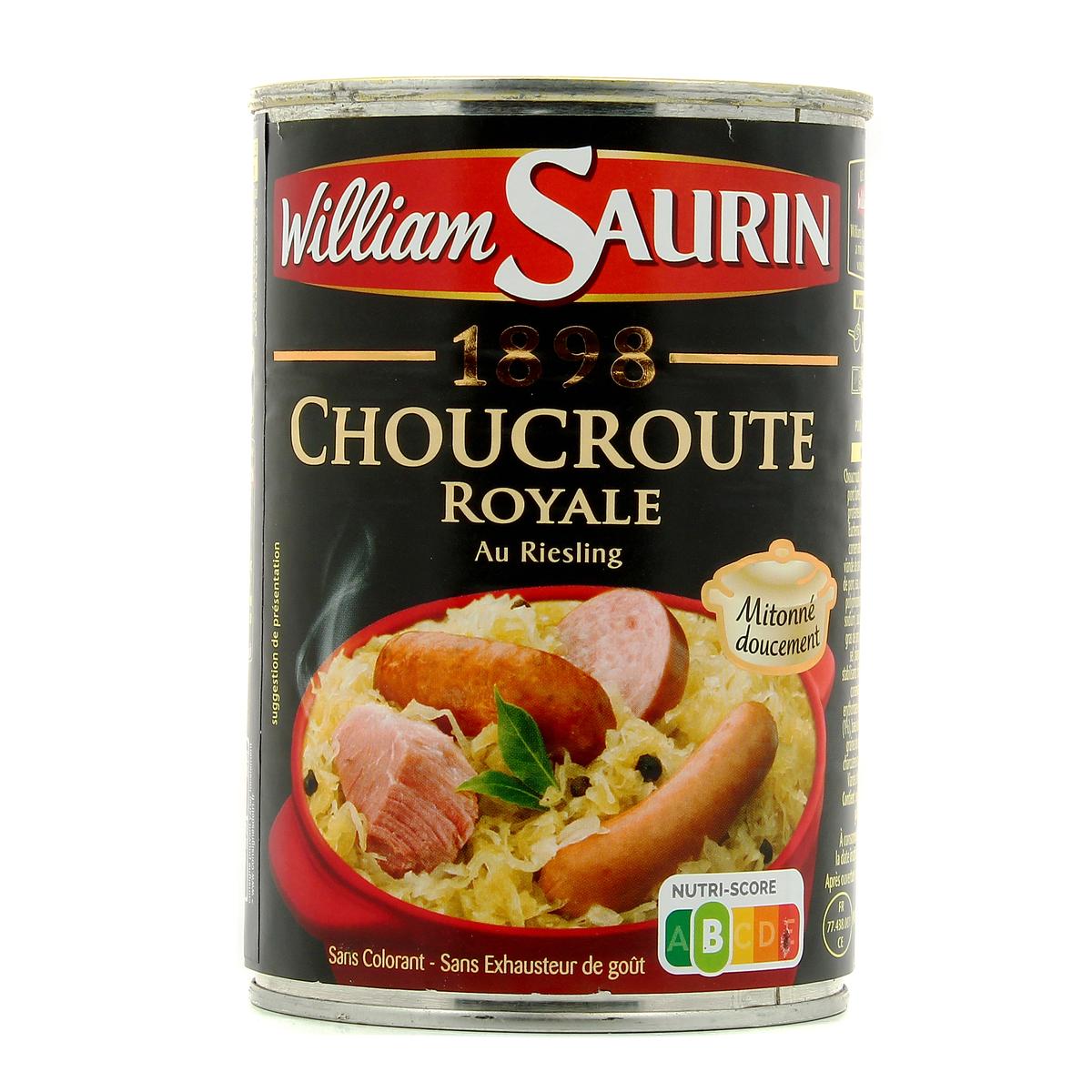 Choucroute royale au riesling d'Alsace. Ingrédients : Choucroute 38%. Charcuterie et viande 32% : viande de porc traitée en salaison, 1 saucisse pur porc fumée,...
