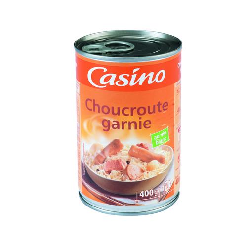Choucroute garnie. Ingrédients : Choucroute 46% - eau - saucisses et saucisson pur porc fumés 16% (viande de porc - morceaux de tête de porc...