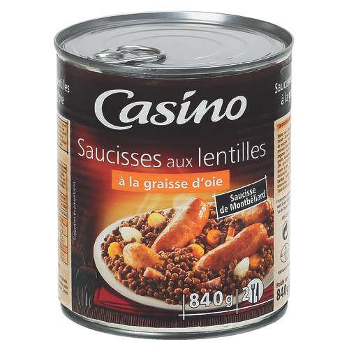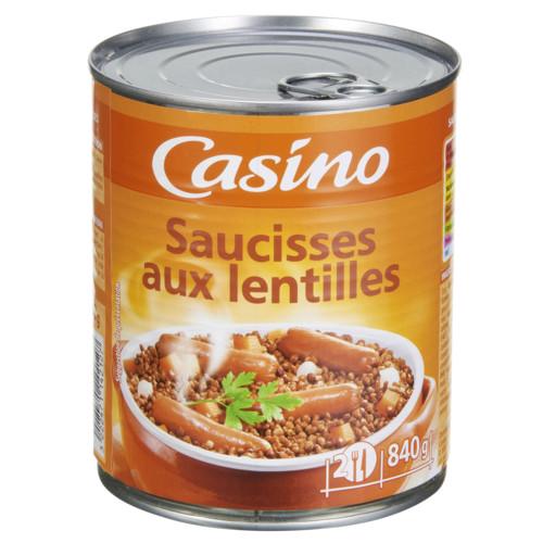 Saucisses lentilles. Ingrédients : Eau - lentilles réhydratées 30% - saucisses fumées 19% (morceaux de tête de porc - gras et couenne de porc -...