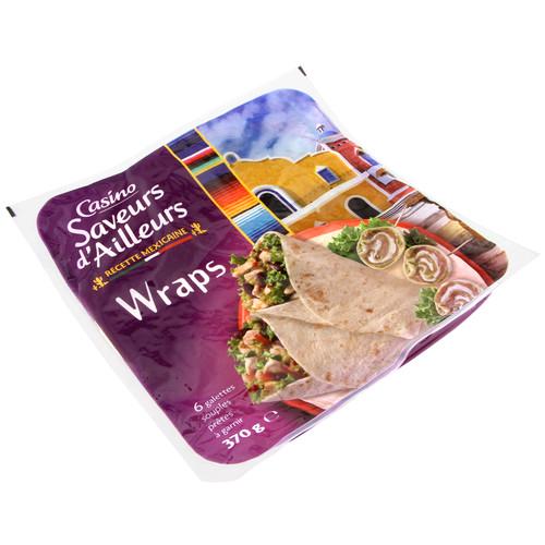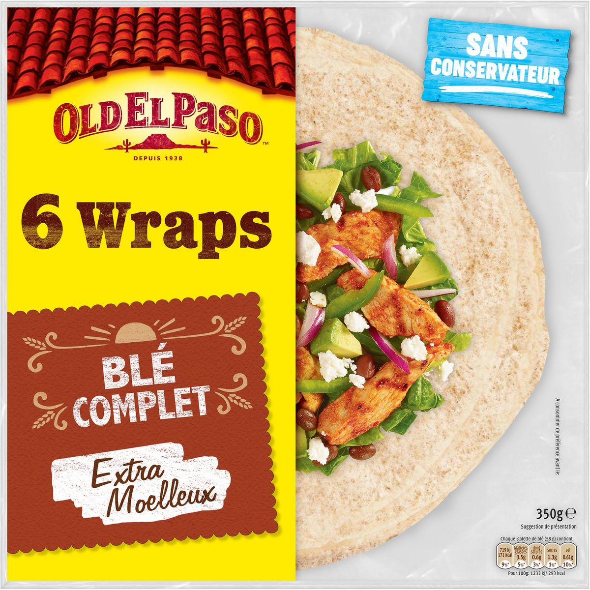 6 wraps au blé - Wrap Blé Complet.Ingrédients : Mélange de farines (58,5 %) (farine de _blé_, farine de _blé_ complet (18 %), son de...