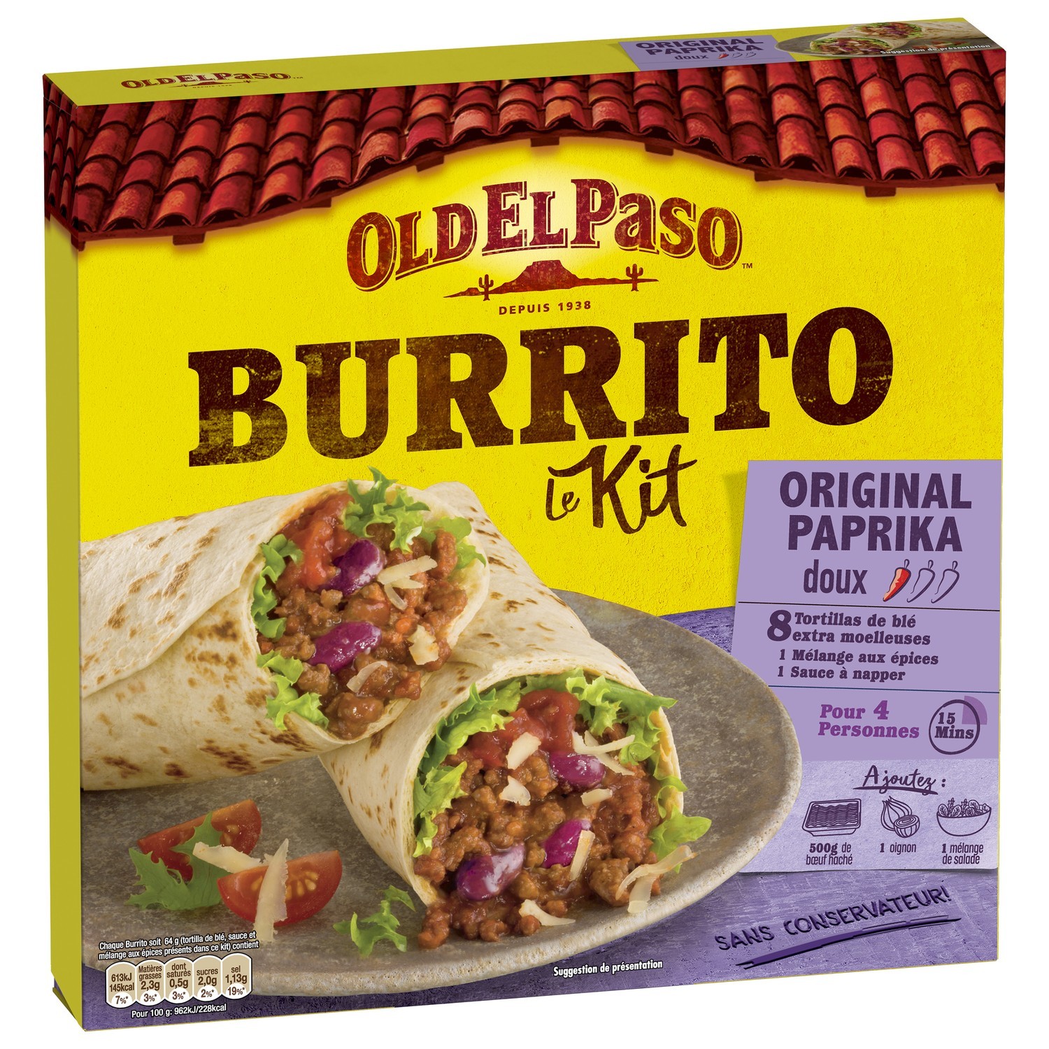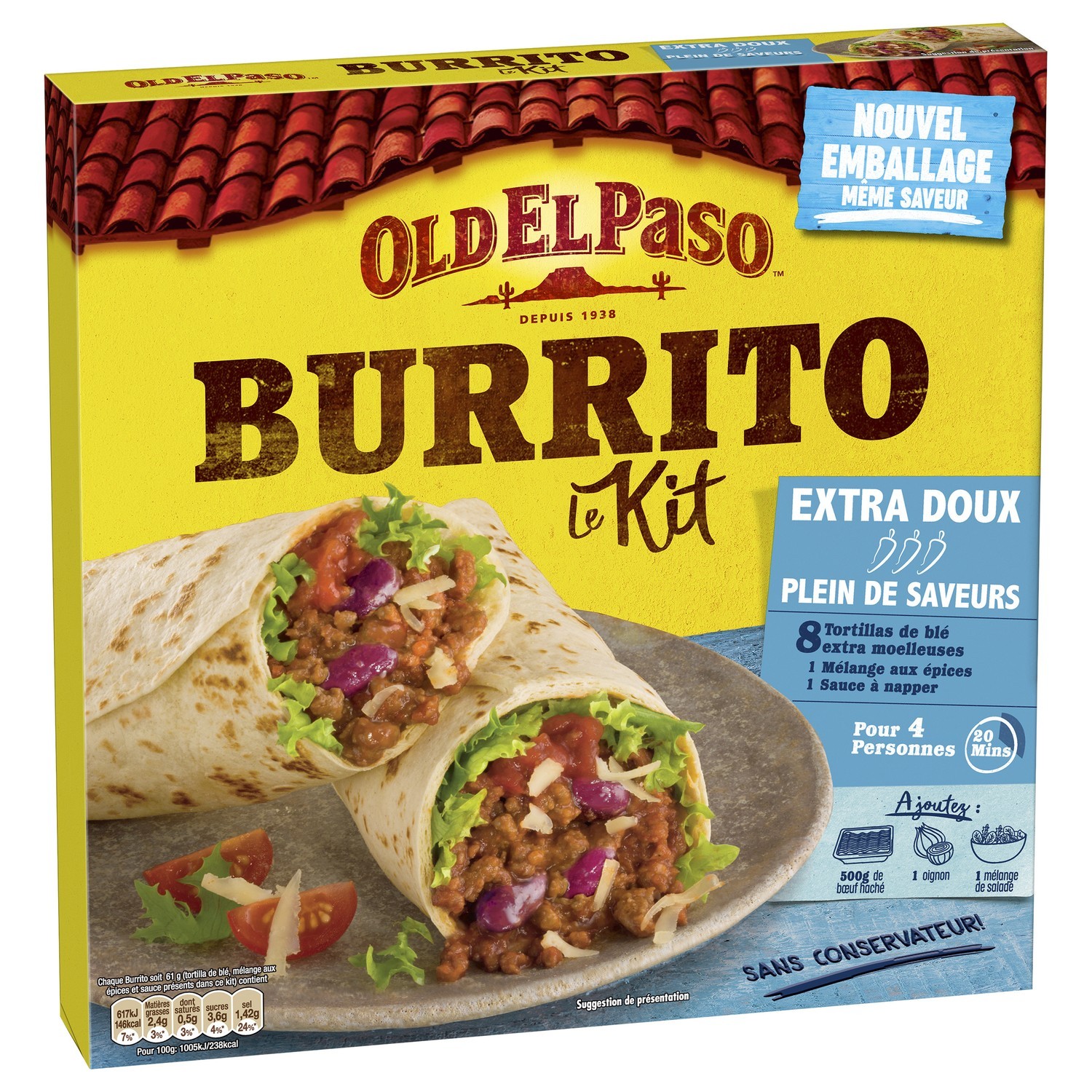 Kit pour burritos contenant 8 tortillas de blé, une sauce tomate épicée aux haricots et aux poivrons et un sachet d'assaisonnement.Ingrédients : Tortillas de blé...