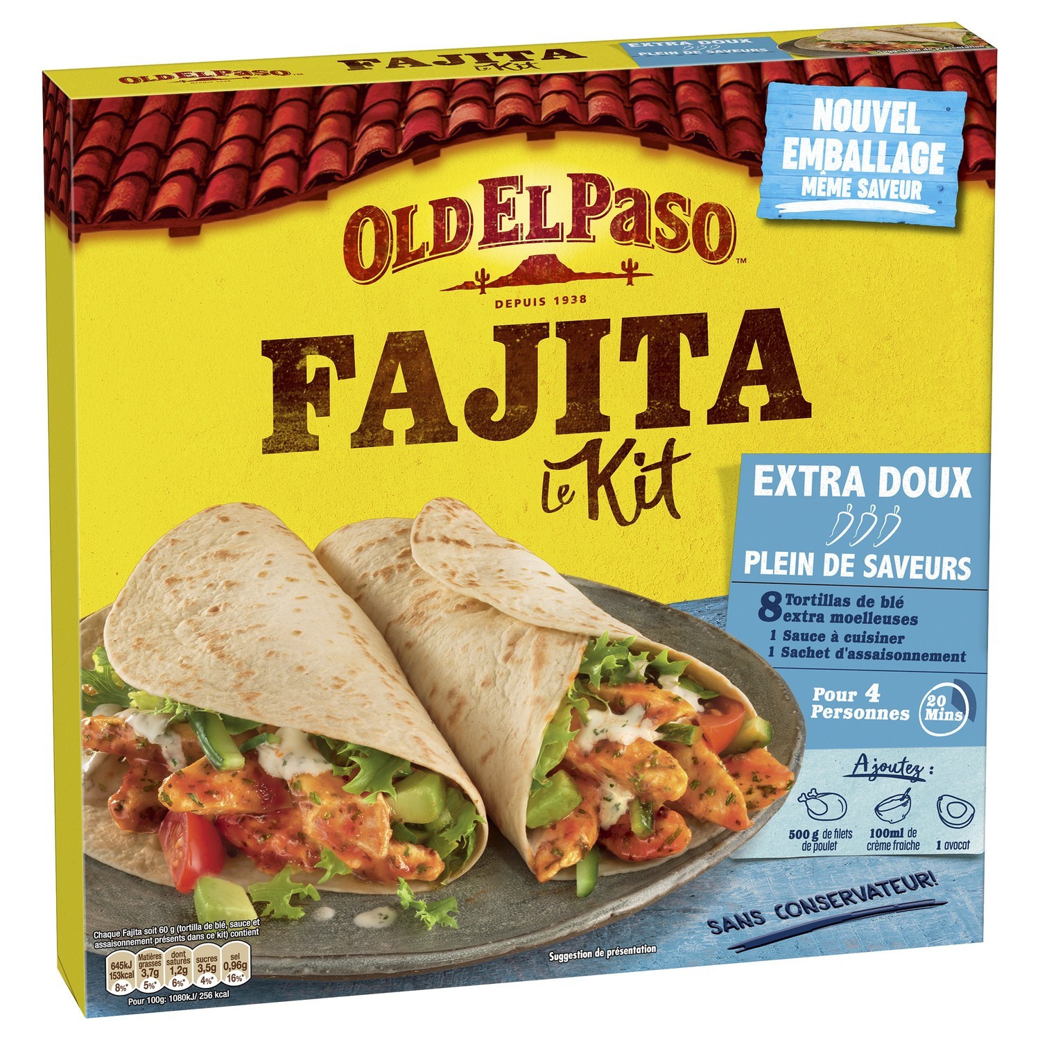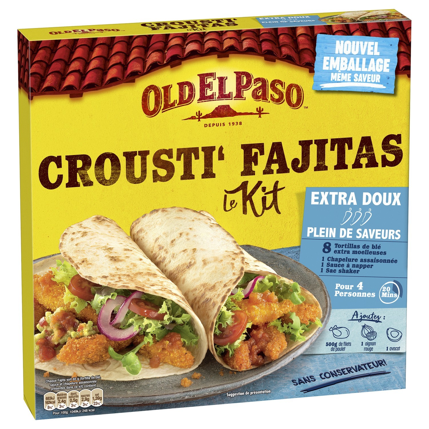 Kit crousti fajitas.Ingrédients : Tortillas de blé extra moelleuses (63%) : farine de blé, eau, stabilisant : glycérol, huile de tournesol, émulsifiant : mono -...