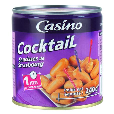 Saucisses de Strasbourg Cocktail.Ingrédients : Saucisses (viande de porc 67% - eau - plasma de porc - sel - gras de porc - arôme naturel...
