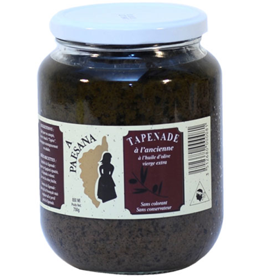 Tapenade à l'Ancienne.Ingrédients : Olives noires (72%), huile d'olive vierge extra (17%), pâte d'anchois (4,5%) (_poisson_), câpres (4,5%), jus de citron, poivre, sel, vinaigre.Quantité :...