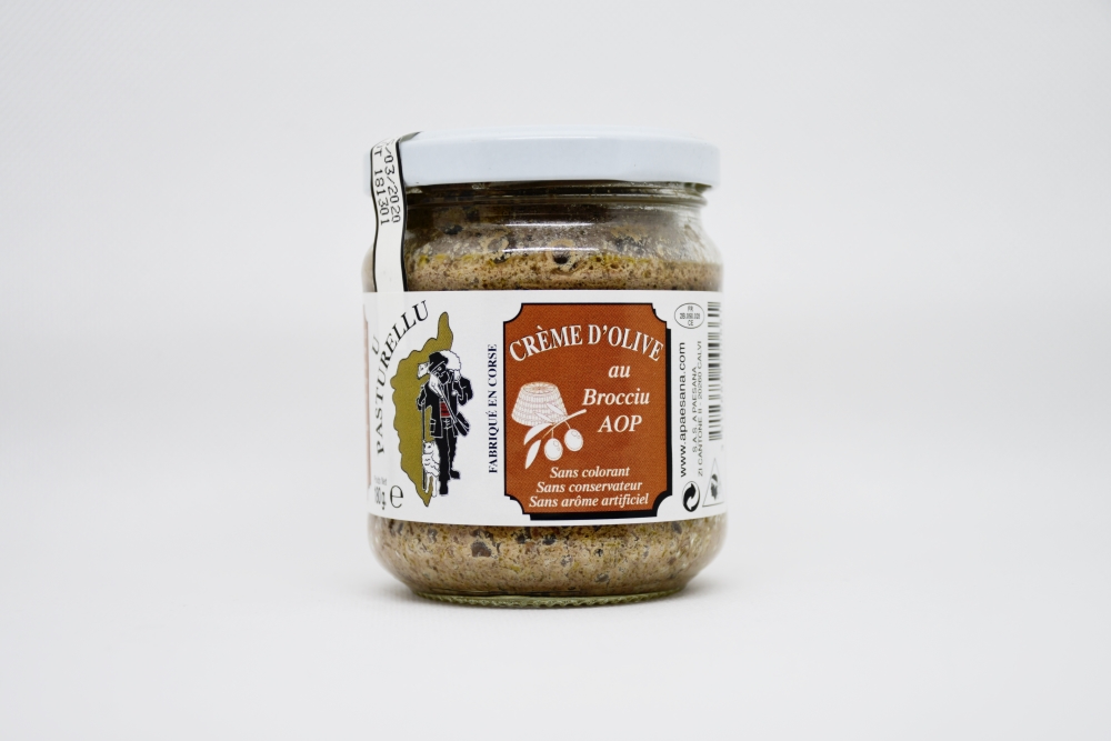 Crème d'Olive au Brocciu AOP.Ingrédients : Olive noire (35 %), Brocciu AOP (35 %), (à base de _lait_), Purée d'olive (14 %), Ail (7 %),...