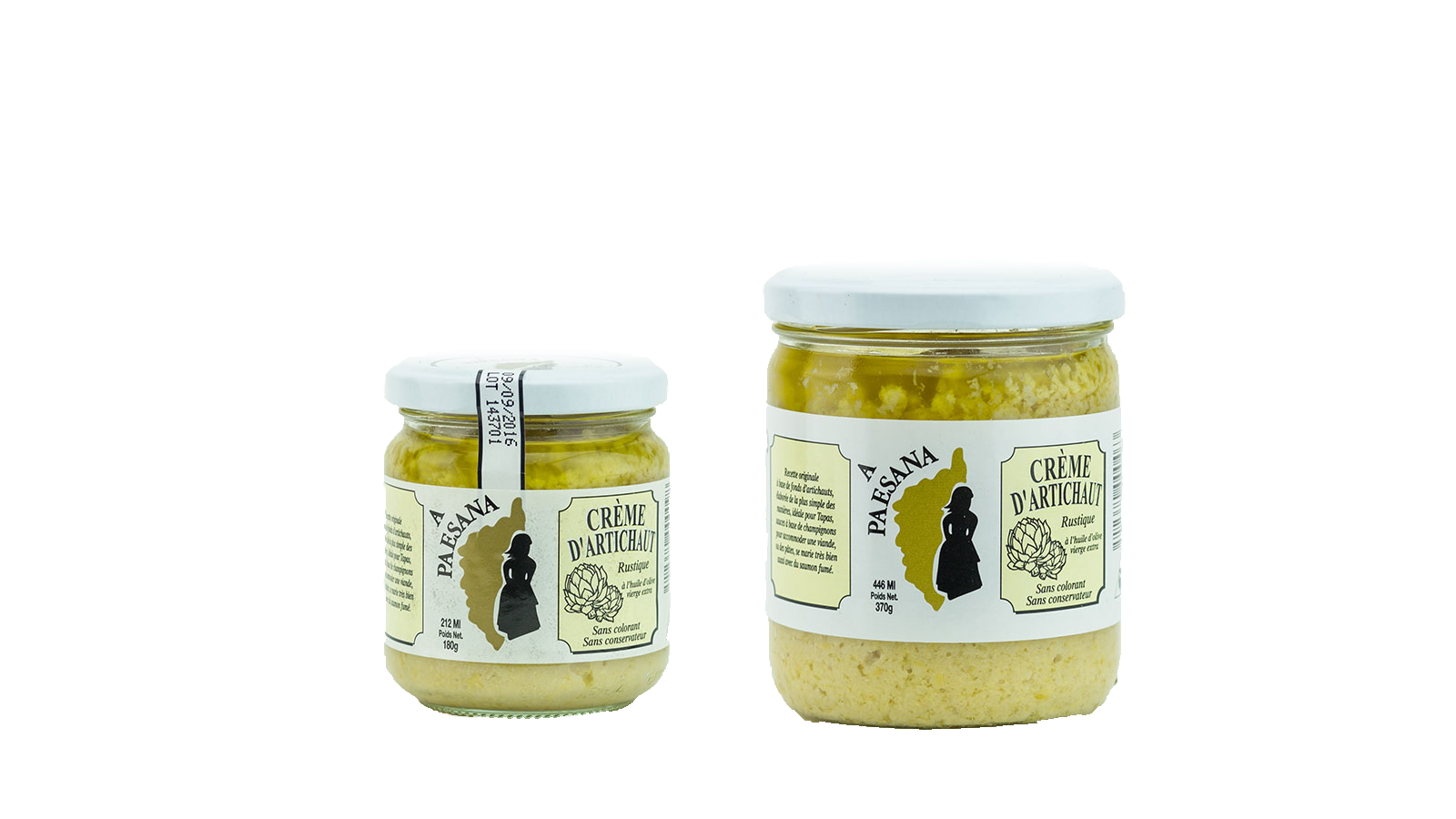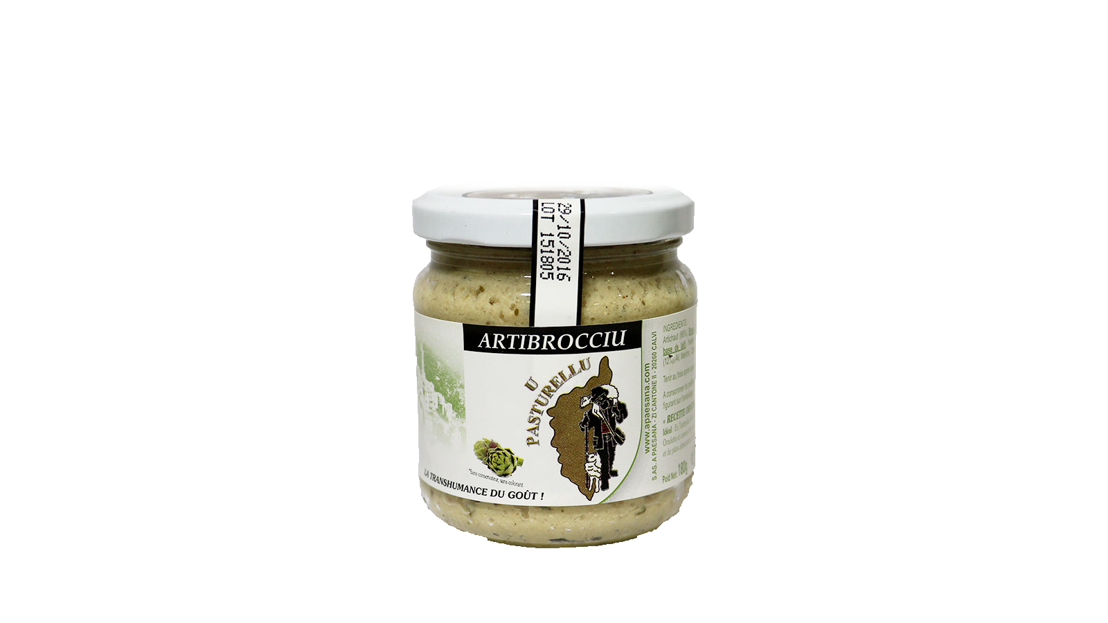 Crème d'artichaut au Brocciu AOP U Pasturel.Ingrédients : Artichaut (66%), Brocciu AOP (18%) (à base de lait), Huile olive vierge extra (12%), Ail, Menthe, Citron,...