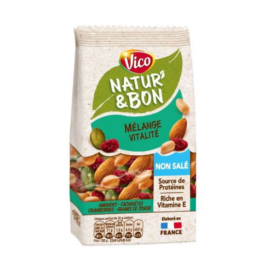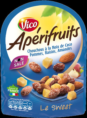 Mélange de fruits et de noix.Ingrédients : CACAHUÈTES 23%, raisins 23%, sucre, pomme 17%, AMANDES 10%, noix de coco 1,5%, sirop de glucose-fructose, huile de...