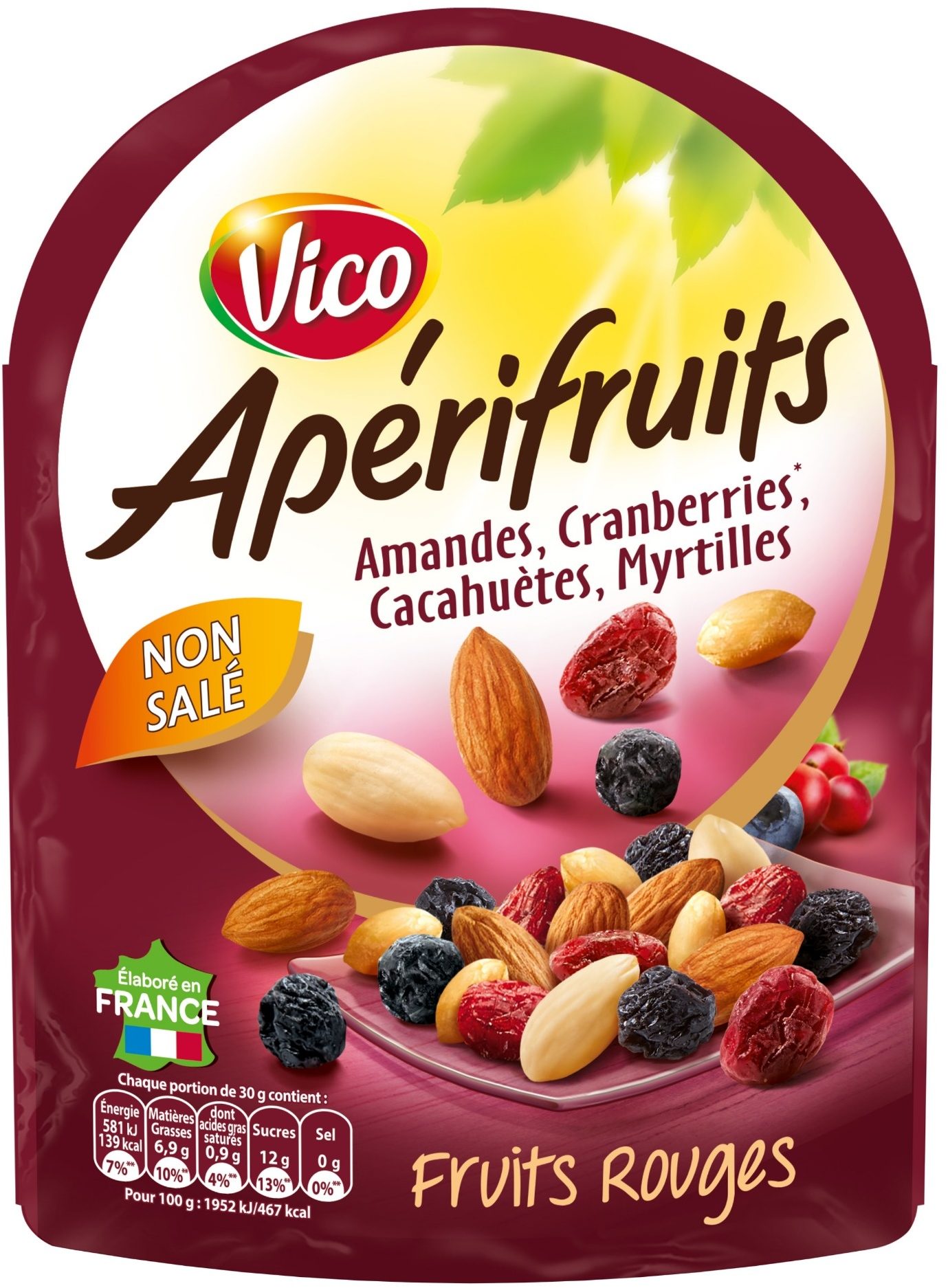 Mélange de fruits et de Cacahuètes.Ingrédients : Cramberries déshydratée sucrée 45% (sucre, canneberge, huile de tournesol), CACAHUÈTES 25%, AMANDES 20%, myrtilles 6.5%, jus de pomme...