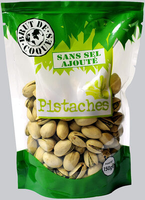 Pistaches Grillées sans sel ajouté.Ingrédients : Pistaches 100%.Quantité : 150 gMarque : Brut de CoquesOrigine : Importation Californie
