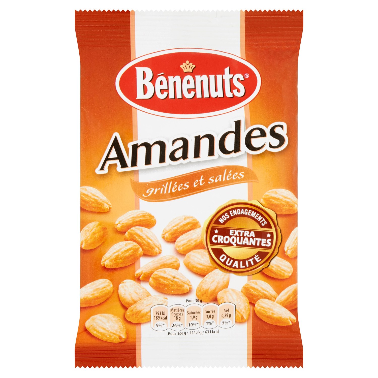 Amandes grillées et salées.Ingrédients : amandes, huile de tournesol, sel. Peut contenir des traces d'autres fruits à coque et d'arachides.Marque : Bénénuts