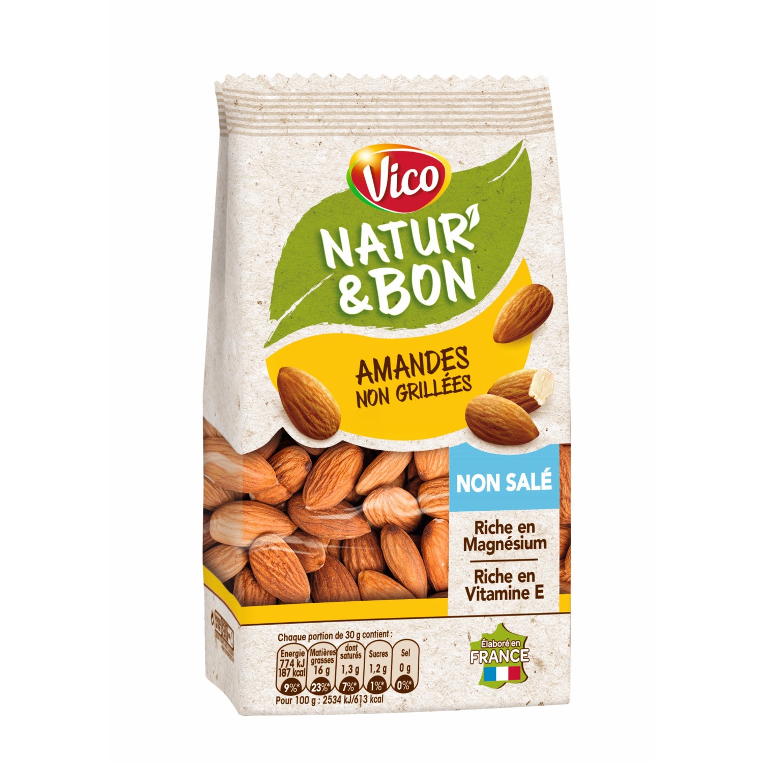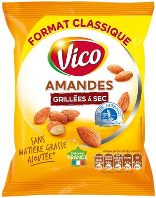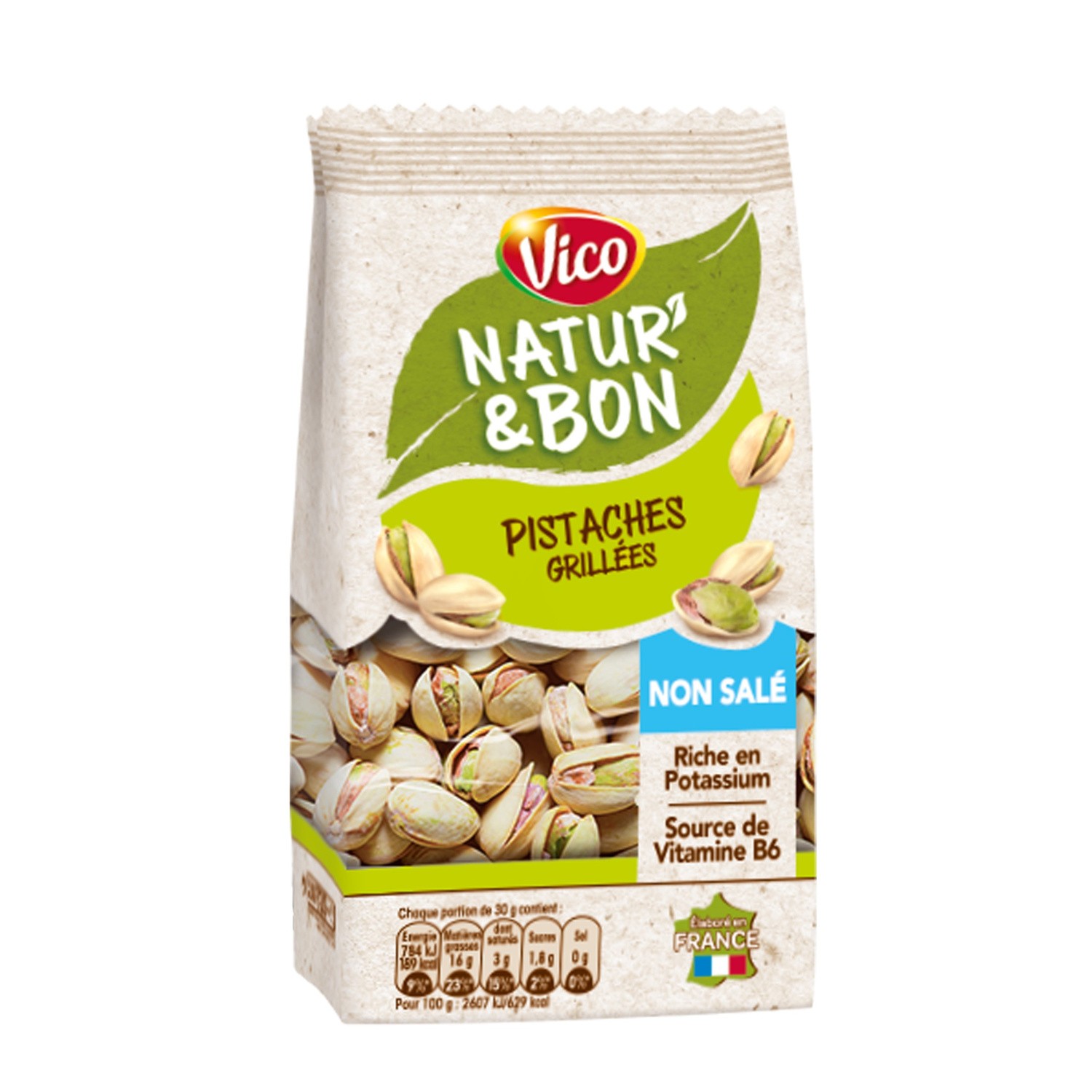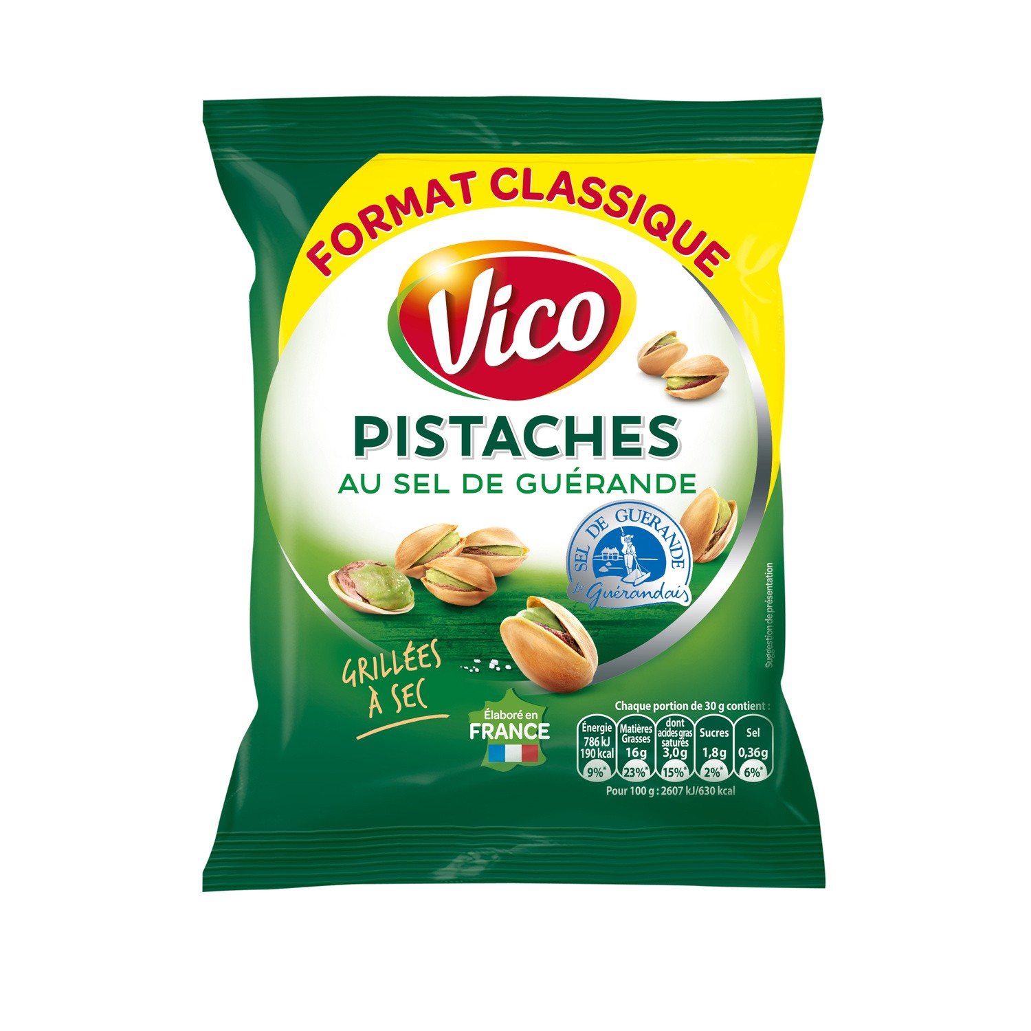 Pistaches grillées à sec et salées.Ingrédients : pistaches 98.5%, sel de Guérande 1.5%.Quantité : 100 g ℮Marque : Vico,IntersnackOrigine : fr:Sel de Guérande