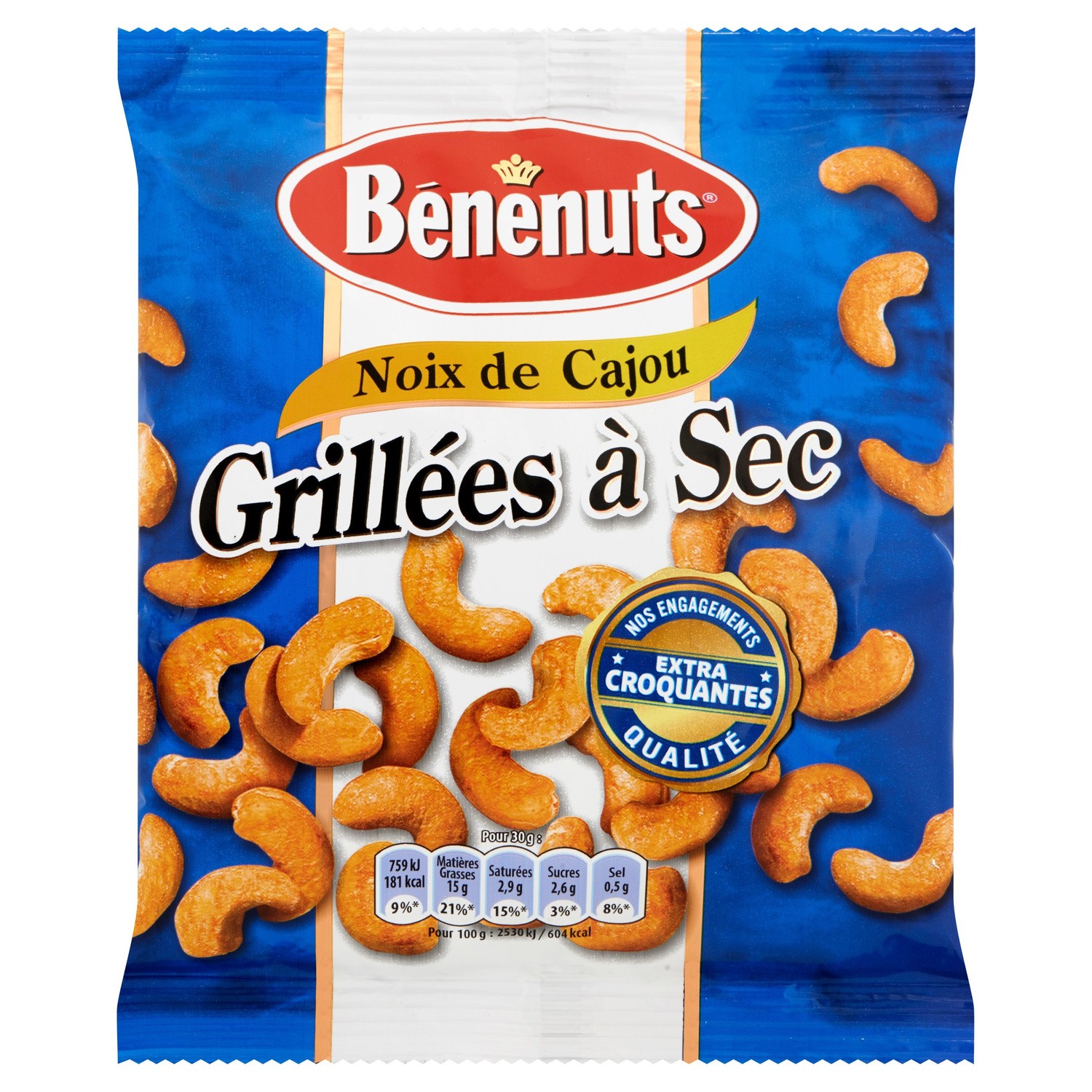 Noix de cajou grillées à sec.Ingrédients : _Noix de cajou_, base aromatisante (sel, amidon modifié, farine de riz, extrait et poudre de levure, sucre caramélisé,...