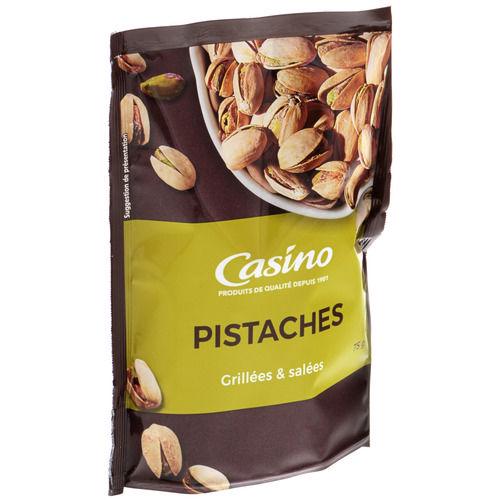 Pistaches grillées et salées.Ingrédients : _pistaches_ - sel.traces d'_arachid_e et d'autres _fruits à coque_.Quantité : 75 gMarque : Casino
