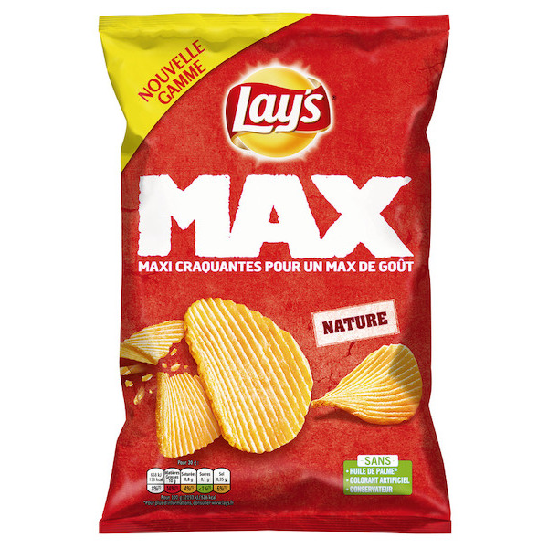 Lay's Max.Ingrédients : Pomme de terre 65%, huiles végétales (tournesol, colza en proportion variable), sel.Quantité : 120gMarque : lays