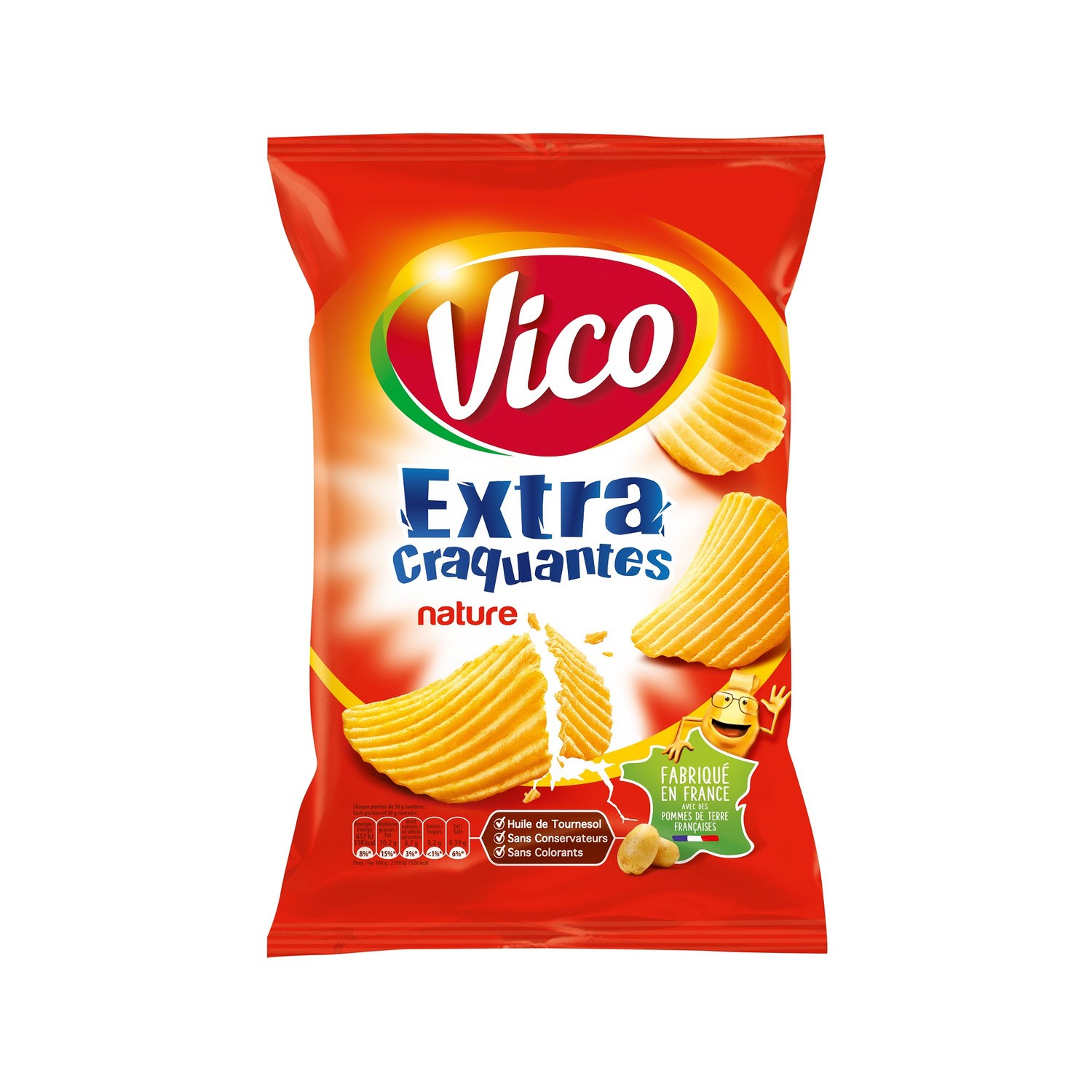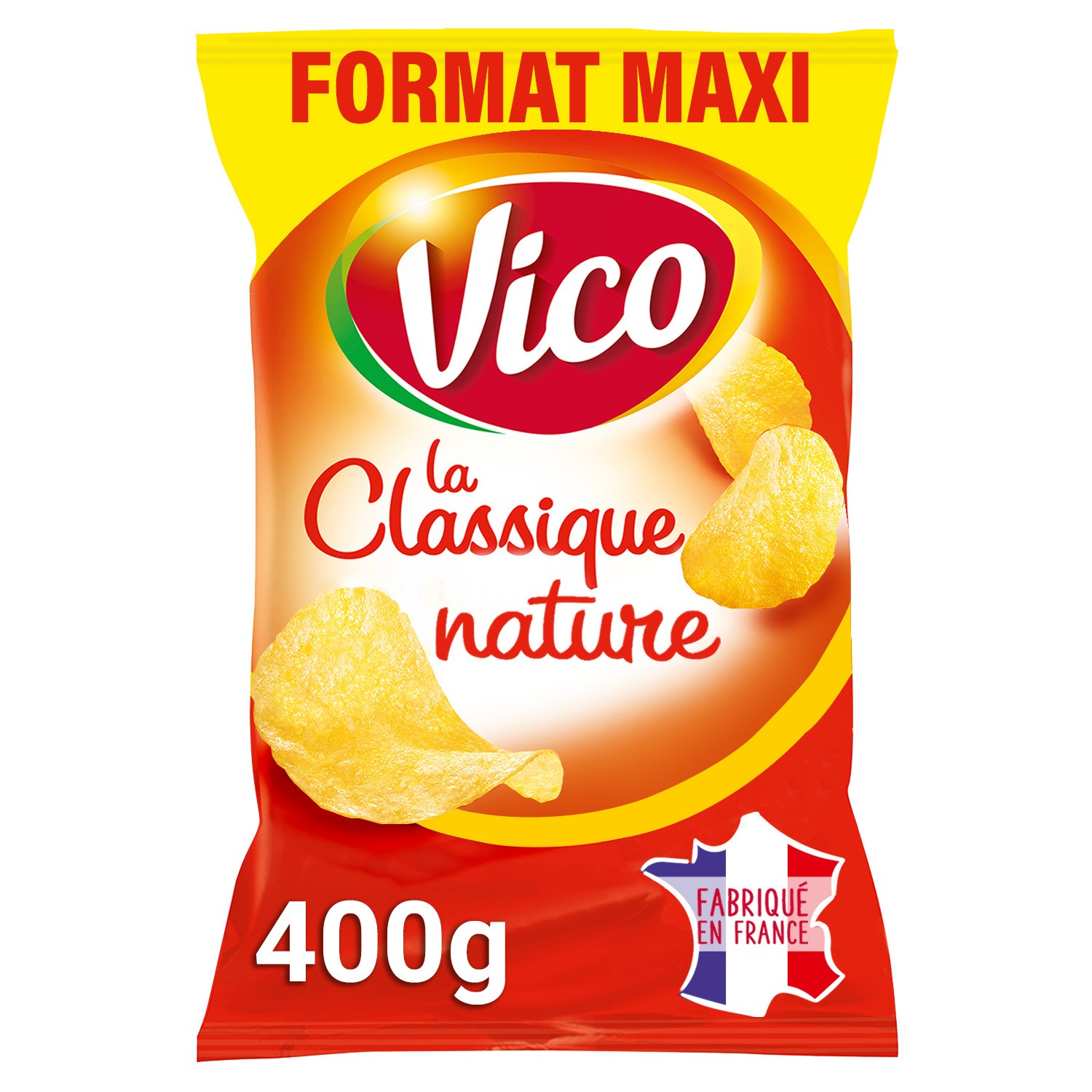 Chips de pommes de terre.Ingrédients : Pommes de terre, huile de tournesol, sel.Quantité : 400 gMarque : Vico,Intersnack