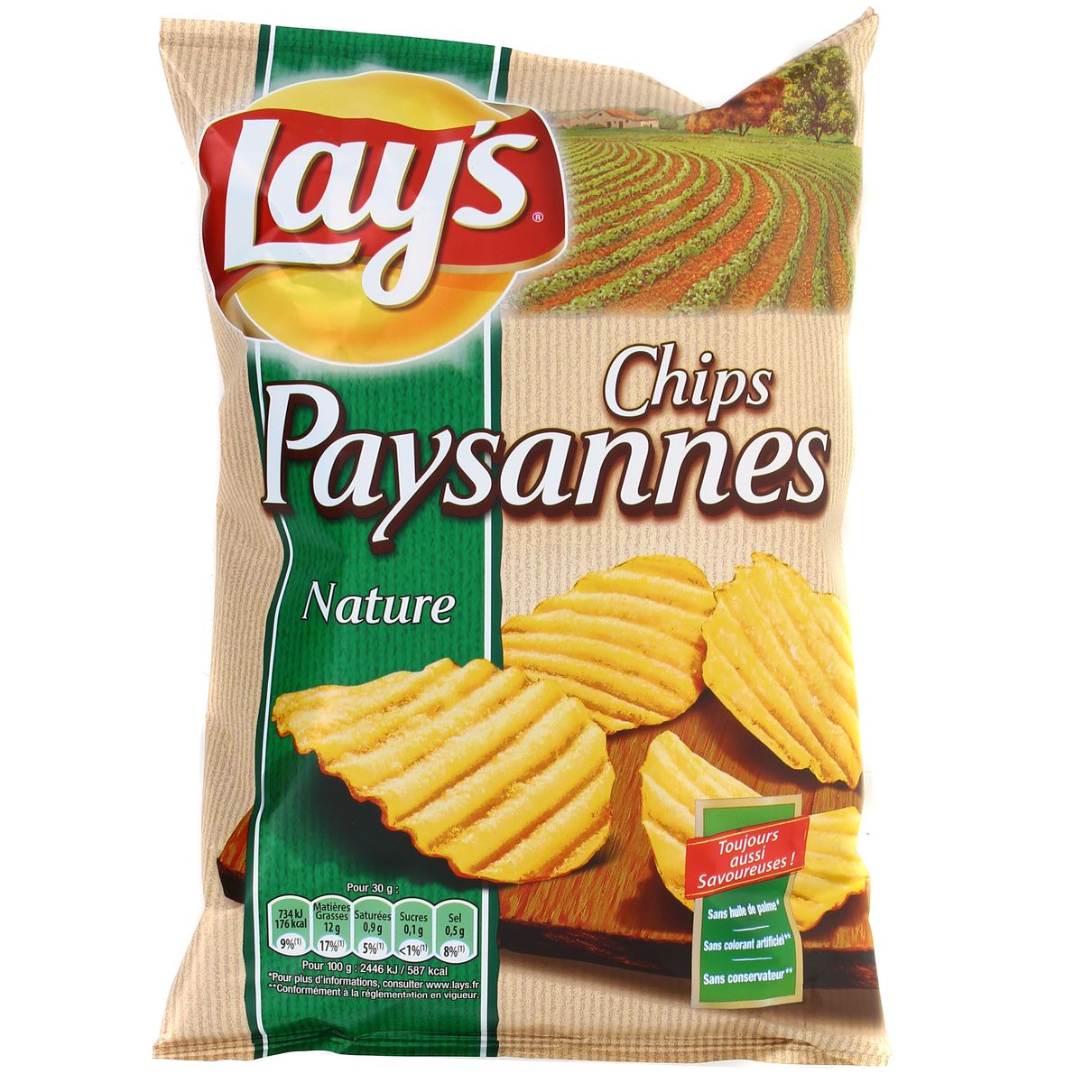 Chips de pommes de terre paysannes goût nature.Ingrédients : Pommes de terre 60%, hules végétales 39% (tournesol, colza), sel.Quantité : 150 gMarque : Lay's