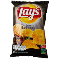Chips de pomme de terre saveur barbecue.Ingrédients : pommes de terre, huiles végetales 32% (tournesol, colza), base aromisante barbecue (sucre, arôme (contient du _soja_), chapelure...