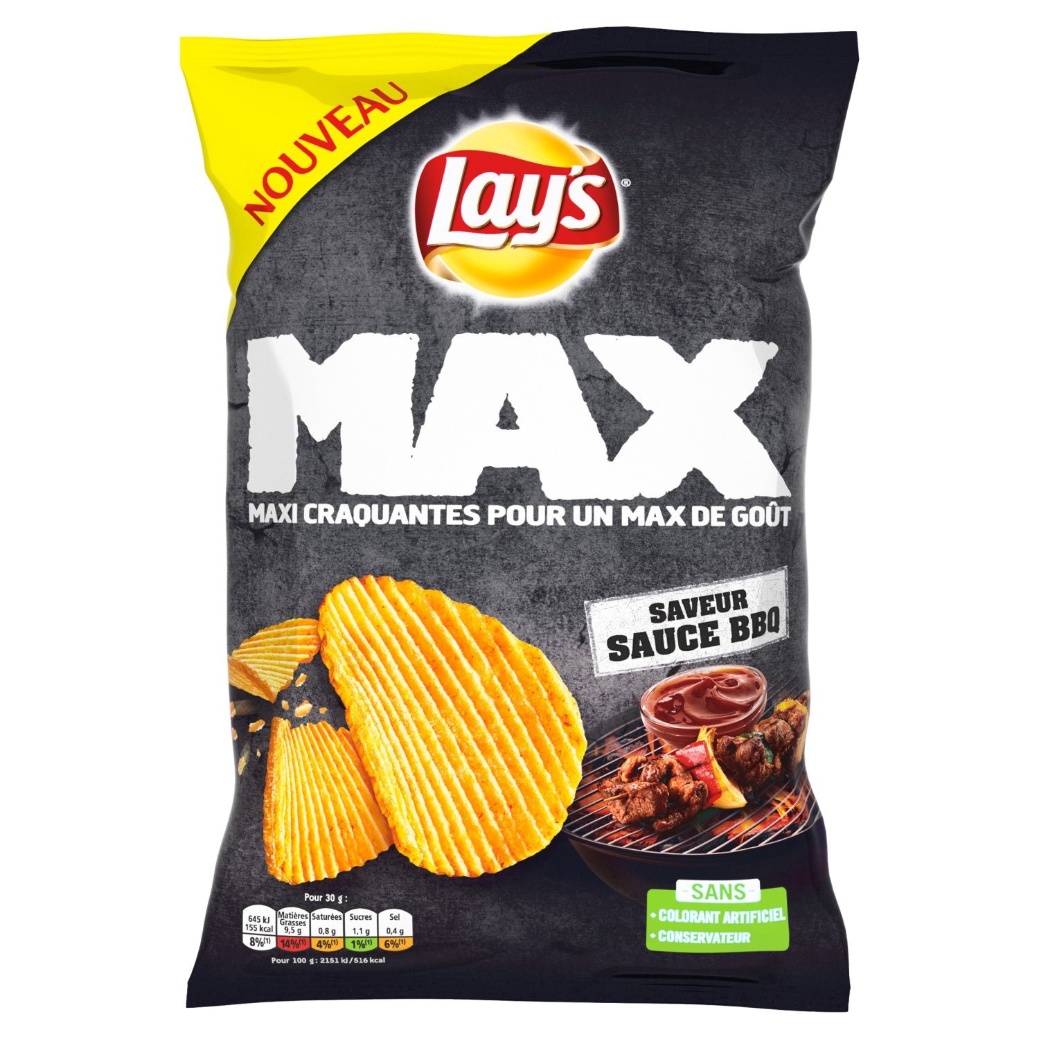 LAYS MAX BBQ.Ingrédients : Pomme de terre 61%, huiles végétales (tournesol, colza en proportion variable), base arômatisante barbecue (arômes, sucrose, farine de blé, glucose fumé,...