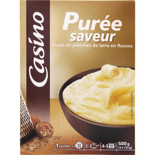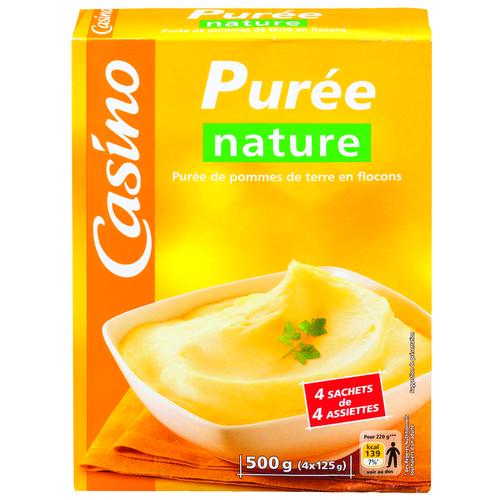 Purée de pomme de terre. Ingrédients : Pomme de terre 99%, émulsifiant : mono - et diglycérides d'acides gras (issu du colza) ; arômes, épices,...