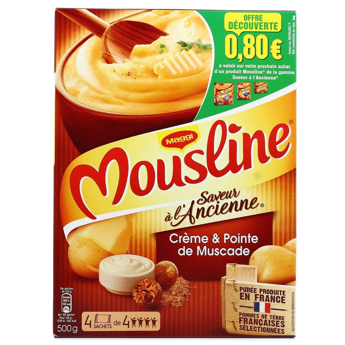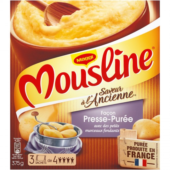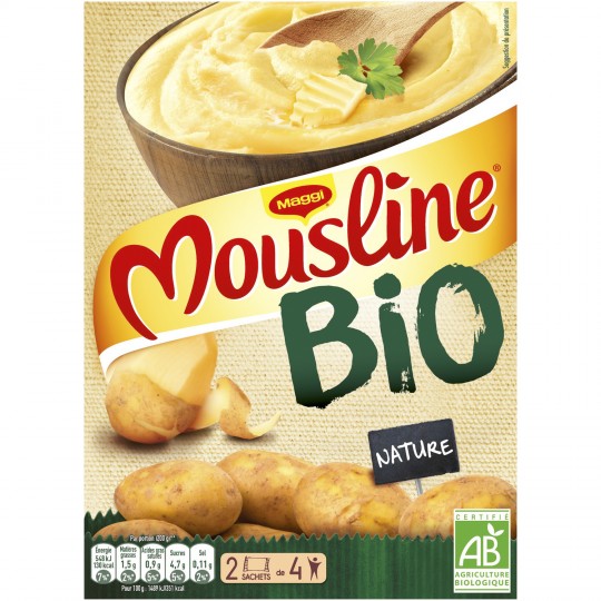 Mousline. Ingrédients : Pomme de terre 99 %, émulsifiant : mono - et diglycérides d'acides gras (issu du colza), arômes, épice, antioxydant : extraits de...