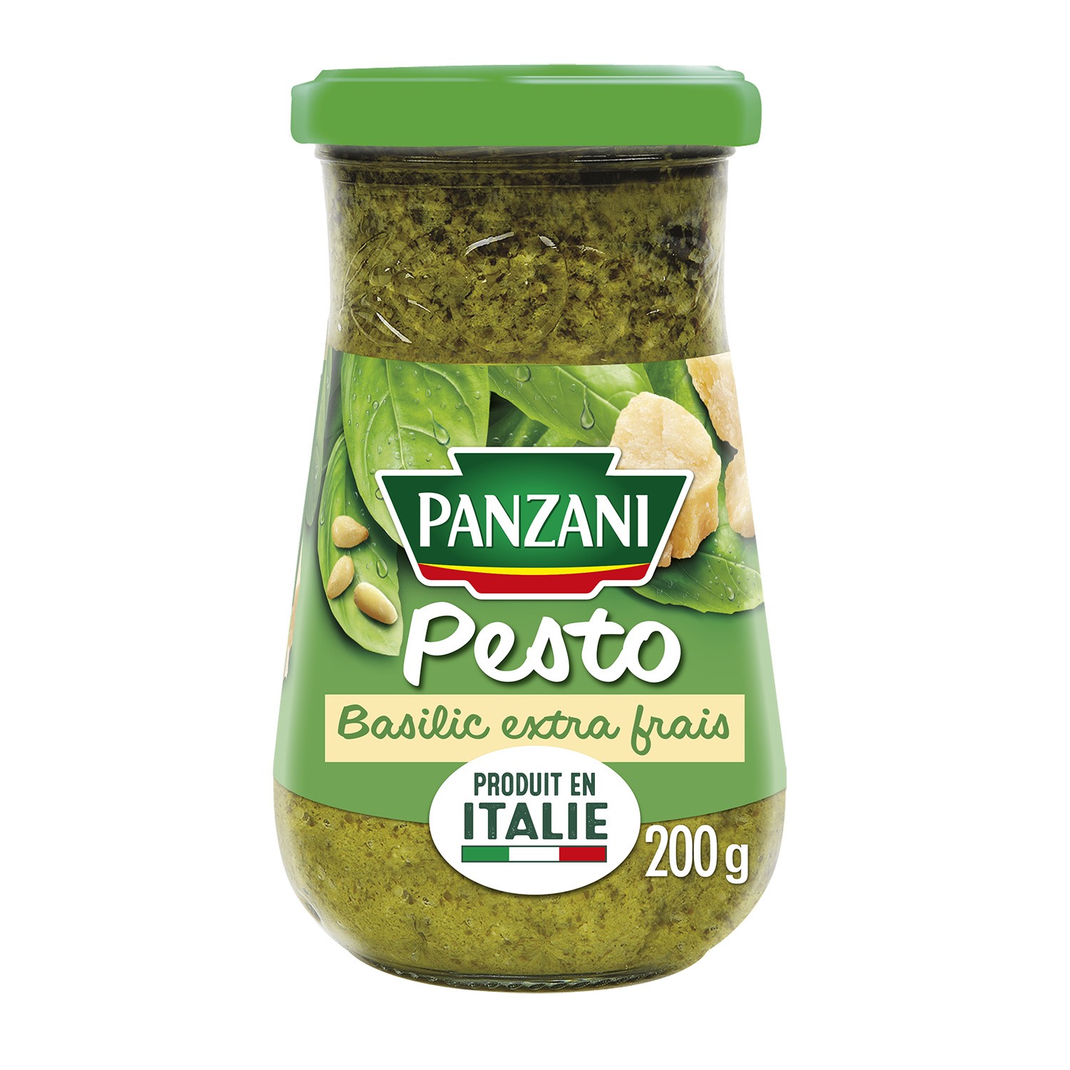 Préparation à base de basilic frais et d'huile d'olive (2 %). Ingrédients : Basilic frais 37%, huile de tournesol 26%, eau, fromages italiens (PECORINO ROMANO*,...