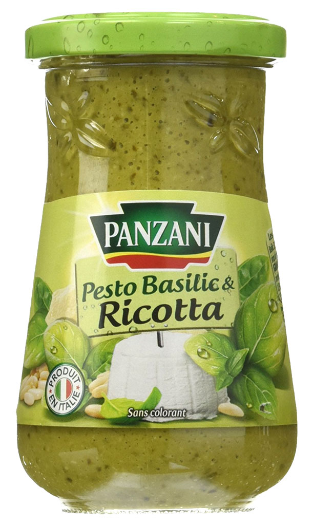 Sauce pesto. Ingrédients : Basilic 32%, huile de tournesol 30%, eau, _RICOTTA_ 5,5%, sirop de glucose, farine de _NOIX DE CAJOU_, _FROMAGES_ (_GRANA PADANO_ (_OEUF_)...