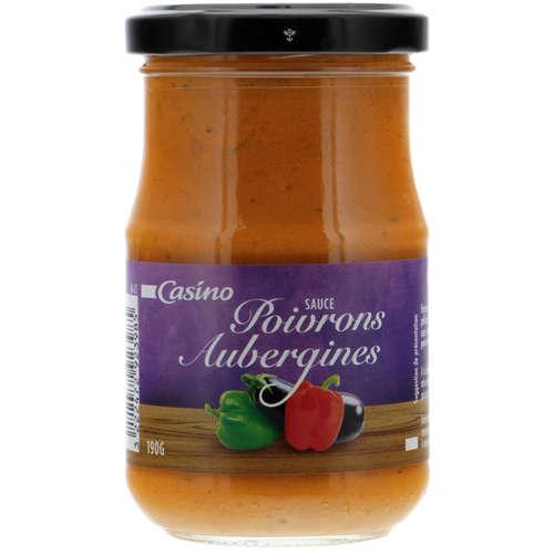Sauce aux poivrons et aux aubergines. Ingrédients : Poivron rouge et jaune 28,7%, huile de tournesol, aubergine 11,9%, _crème_ fraîche, poudre de tomate, double concentré...