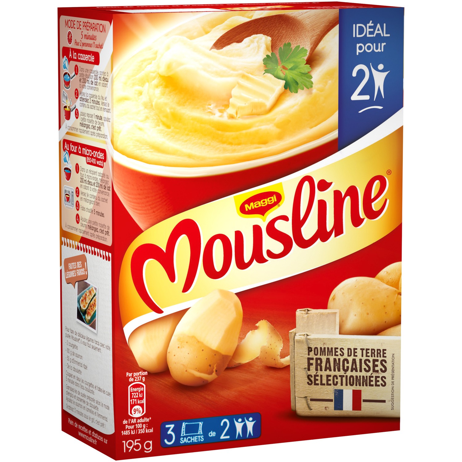 Mousline. Ingrédients : Pomme de terre 99%, émulsifiant : mono - et diglycérides d'acides gras (issu du colza); arômes, épice, anti-oxydant : extraits de romarin...