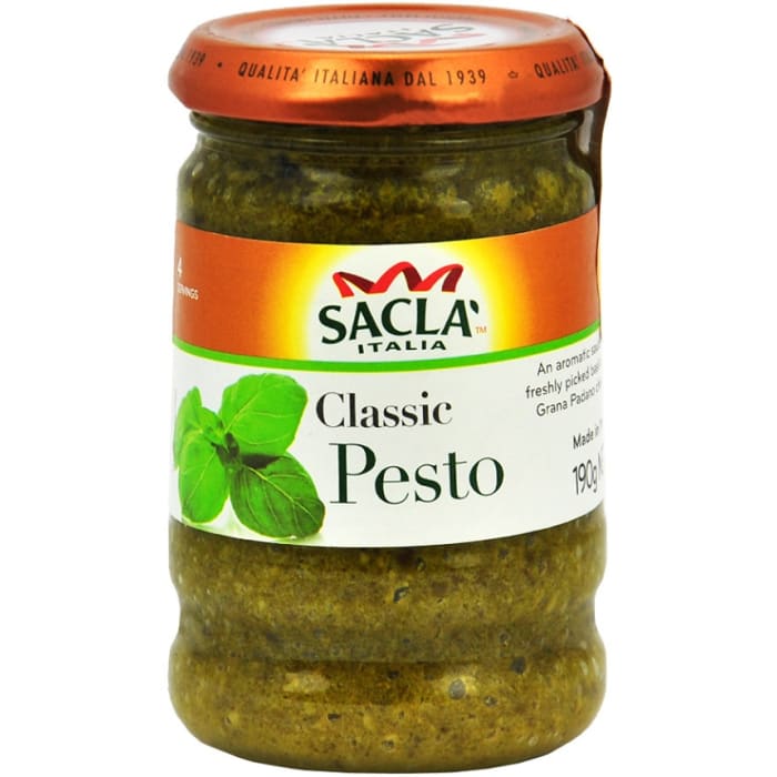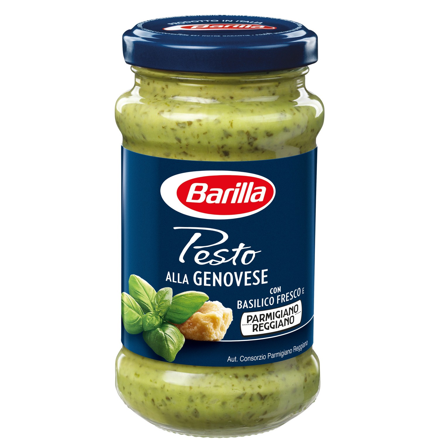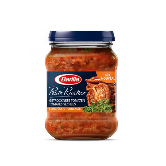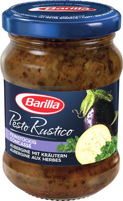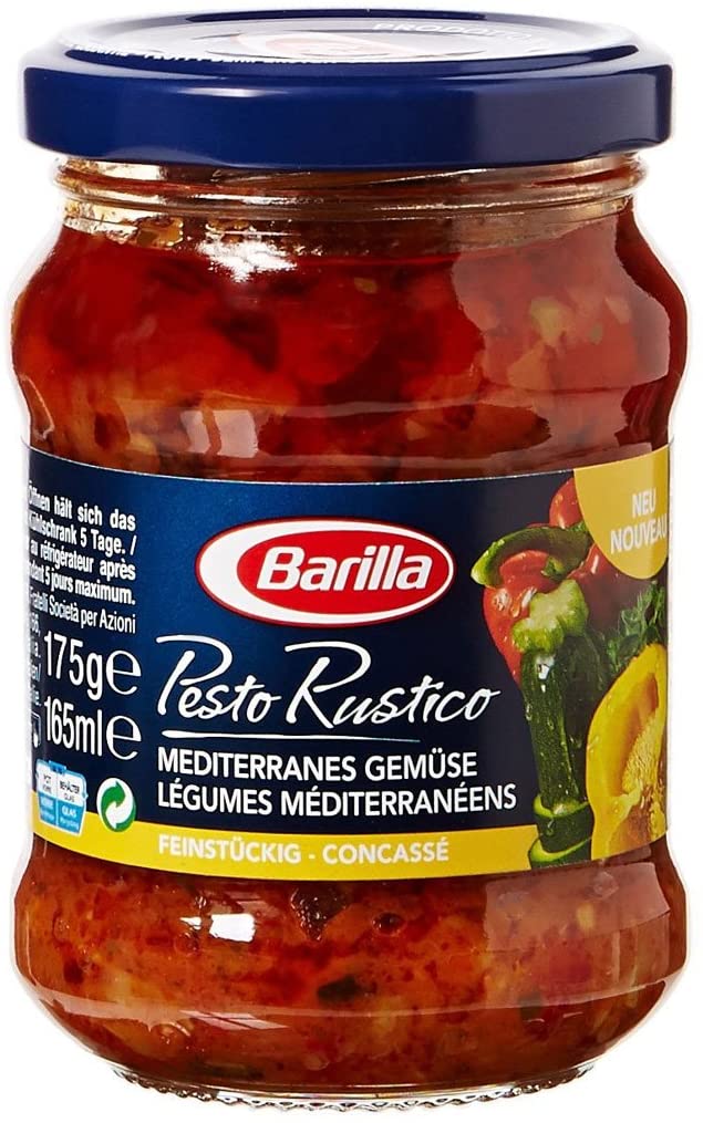 Pesto mit Basilikum und Rucola. Ingrédients : Sonnenblumenöl 38,5%, Basilikum 20,7%, Petersilie 11,8%, Glukosesirup, _Schafkäse_ Pecorino Romano g.U. (_Milch_), _Cashewkerne_, _Molkepulver_ (_Milch_), Ricotta-_Käse_ (_Molke_, _Milch_),...