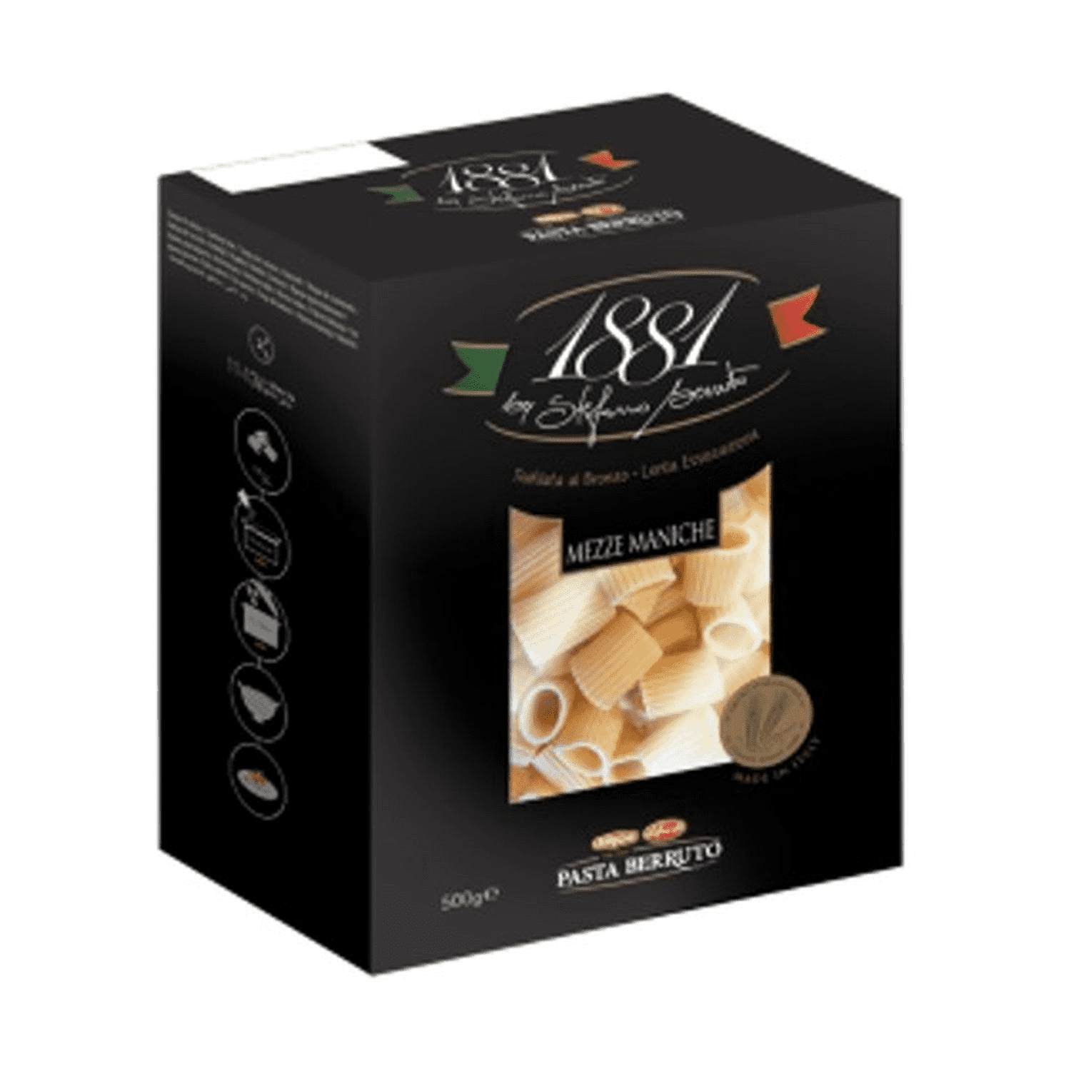 Mezze Maniche. Ingrédients : Semoule de _blé_ dur. Quantité : 500 g e Marque : 1881 By Stefano serruto,Pasta Berruto Origine : Italie