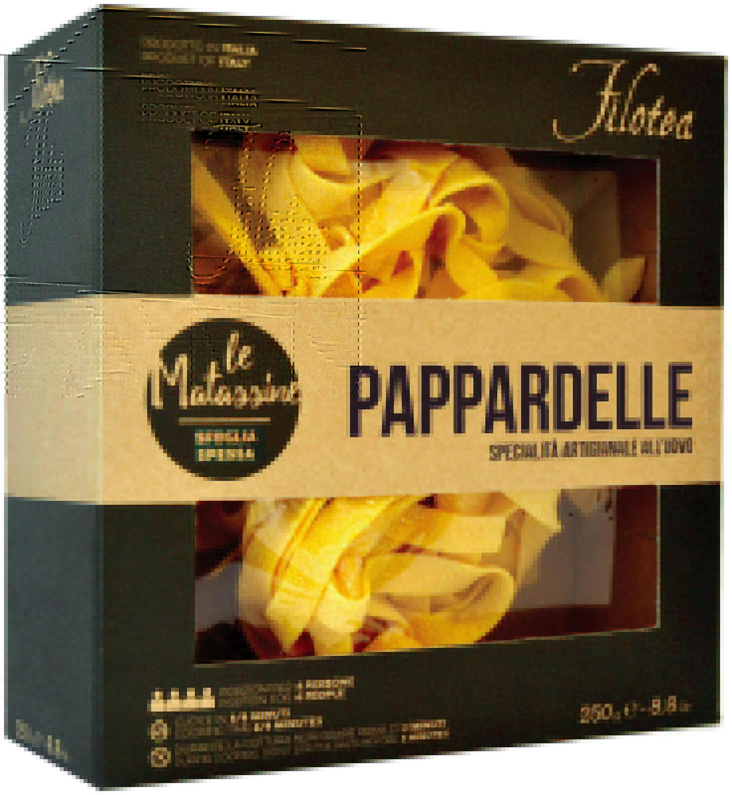 Filotea "Le Matassine" Egg Pappardelle Nests - 8.8 Oz. Ingrédients : semoule de blé dur, log œufs (30%), farine de blé Contient des allergènes: oeuffs,...