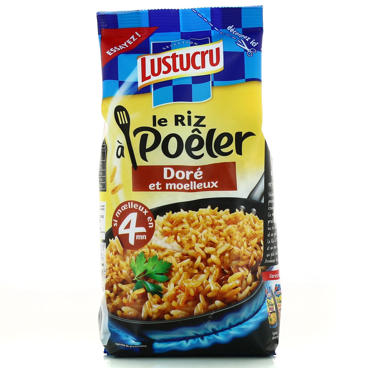 Riz long grain cuisiné. Ingrédients : Riz long grain 98 %, huile de tournesol, arôme. Quantité : 400 g Marque : Lustucru