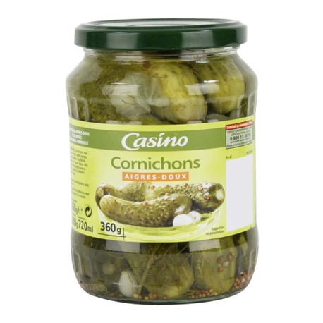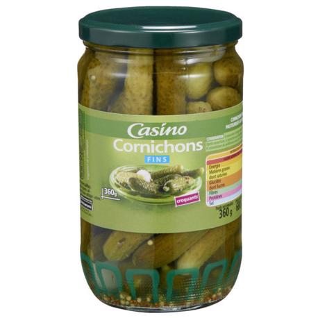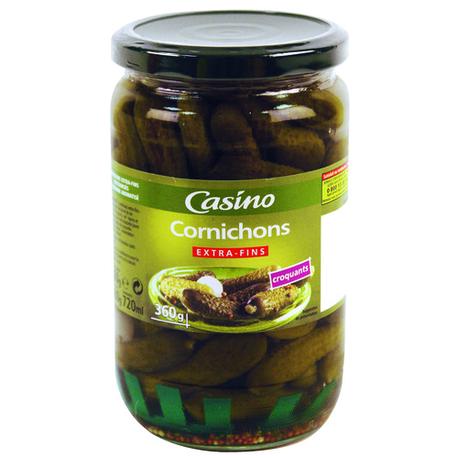 Cornichons pasteurisés au vinaigre.Ingrédients : Cornichons (contient _sulfites_) - eau - vinaigre d'alcool - oignons - sel - estragon - graines de _moutarde_ jaune -...
