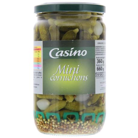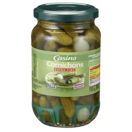 Cornichons extra-fins pasteurisés au vinaigre.Ingrédients : Cornichons (contient _sulfites_) - eau - vinaigre d'alcool - petits oignons - sel - graines de _moutarde_ jaune et...