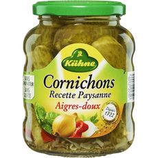 Cornichons pasteurisés au vinaigre.Ingrédients : cornichons (dont SULFITES), vinaigre d'alcool 42%, oignon, sel, aromates 0,8% (graines de MOUTARDE, graines de coriandre), arôme naturel d'épices.Quantité :...