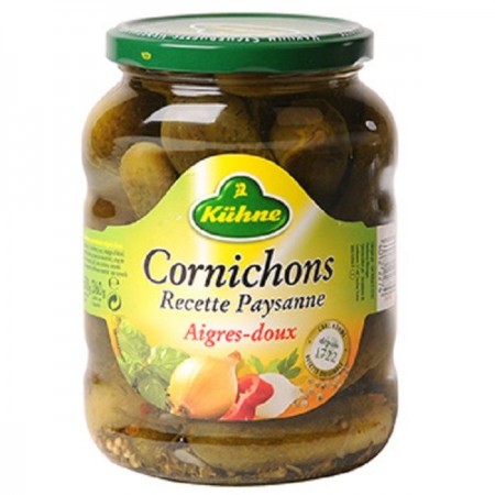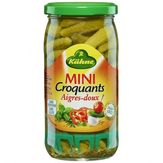 Cornichons très fins pasteurisés au vinaigre.Ingrédients : Cornichons, eau, vinaigre d'alcool, petits oignons, sel, graines de moutarde jaune et brune, estragon, arôme, sulfites Quantité :...