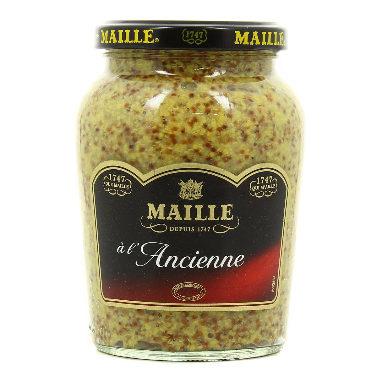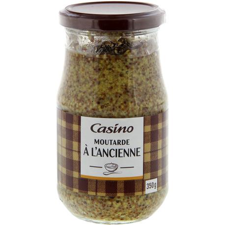 Moutarde à l'ancienne.Ingrédients : Eau - vinaigre d'alcool - graines de _moutarde_ - téguments de graines de _moutarde_ - sel - acidifiant : acide citrique...