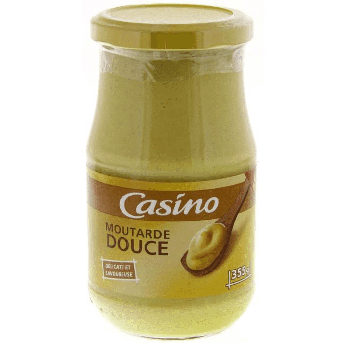 Moutarde douce.Ingrédients : Eau - graines de _moutarde_ - vinaigre d'alcool - huile de tournesol-sucre - sel - épaississant : gomme xanthane - acidifiant :...