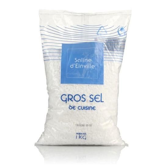 Gros Sel Sachet 1 KG.Ingrédients : sel, anti-agglomérant : E536 ou E535Quantité : 1kgMarque : Saline d'Einville