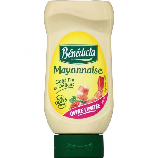 Mayonnaise aux oeufs frais.Ingrédients : Huile de colza, eau, _moutarde_ de Dijon (eau, graines de _moutarde_, vinaigre d'alcool, sel), jaunes d'_oeufs_ frais (5 %), vinaigres...