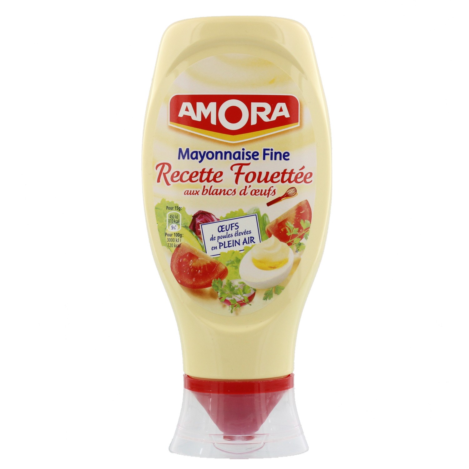 Mayonnaise.Ingrédients : huile de colza, OEUF de poules élevées en plein air 9% (dont blanc d'OEUF 4%), eau, vinaigre, sel, sucre, arômes, jus de citron...