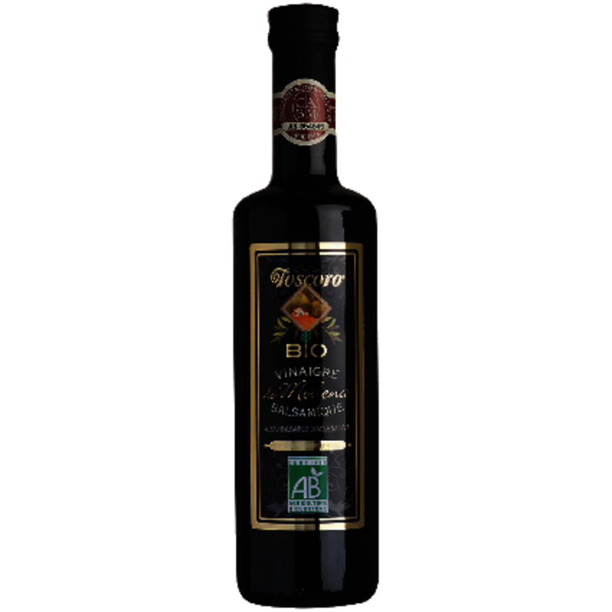 Vinaigre balsamique de Modène.Ingrédients : Vinaigre de vin*, moût de raisin concentré*. Contient des _sulfites_.*Biologique.Quantité : 0,5 lMarque : Toscoro