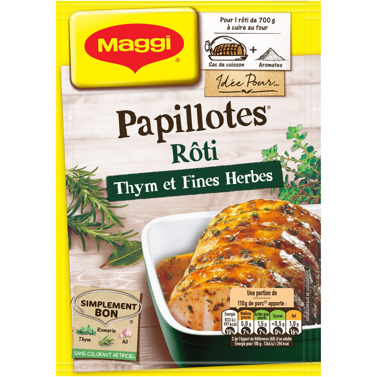sachet cuisson et assaisonnement déshydraté pour cuisson à base d'herbes de Provence. Ingrédients : amidon de maïs - pomme de terre - sel - herbes...
