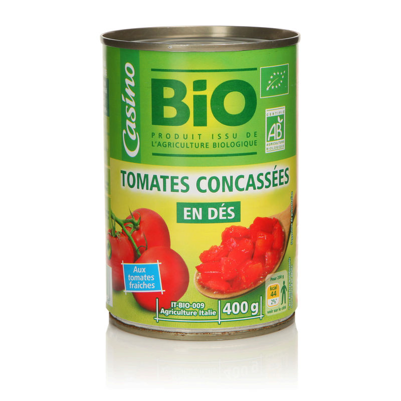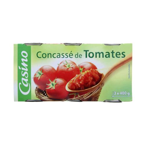 Concassé de Tomates. Ingrédients : tomates pelées concassées 60%, jus de tomate, acide citrique Quantité : 400 g Marque : Casino