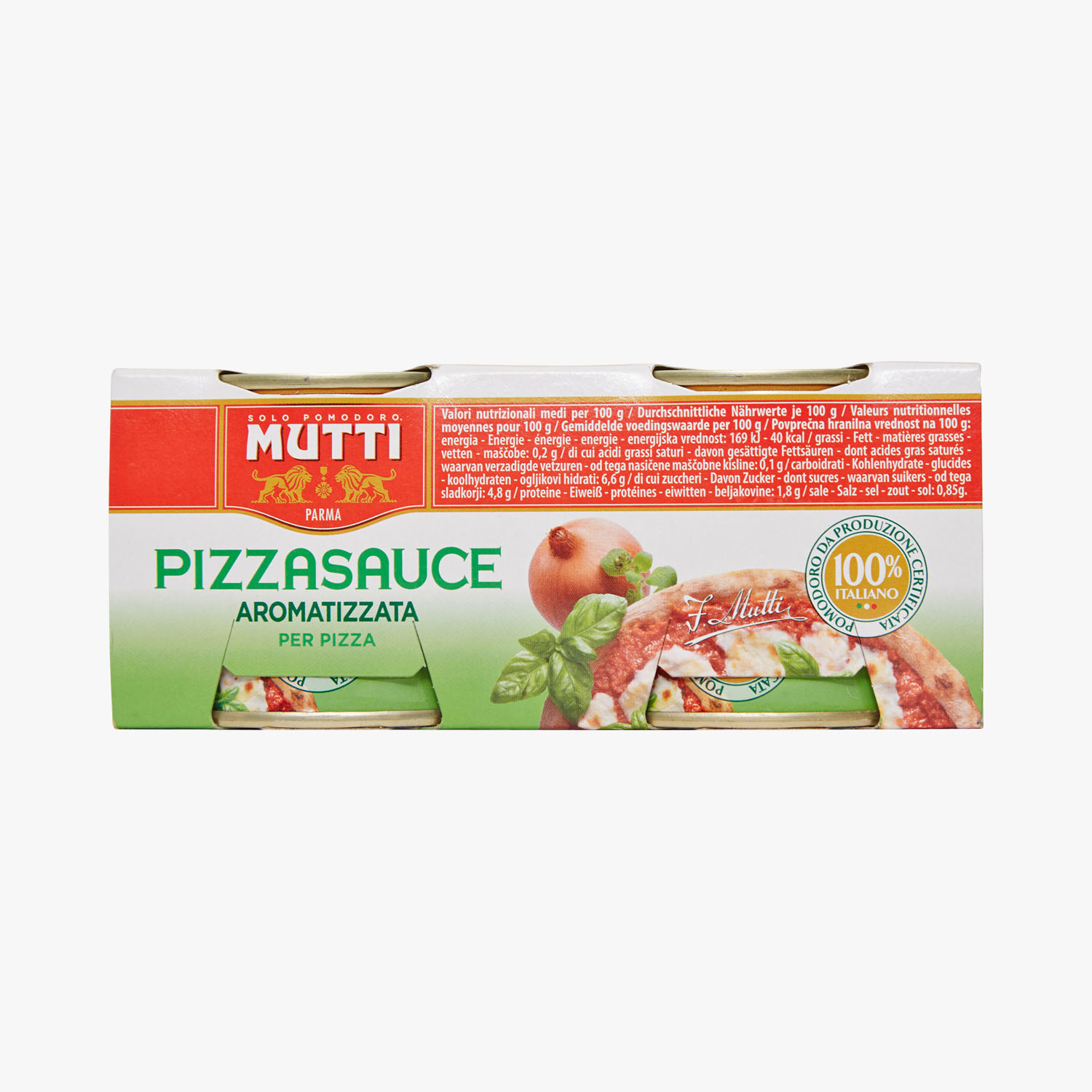 Pizza sauce mutti. Ingrédients : tomate 99,2%, sel, basilic 0,05%, origan 0,04%, oignon 0,03%, arôme naturel Marque : Mutti