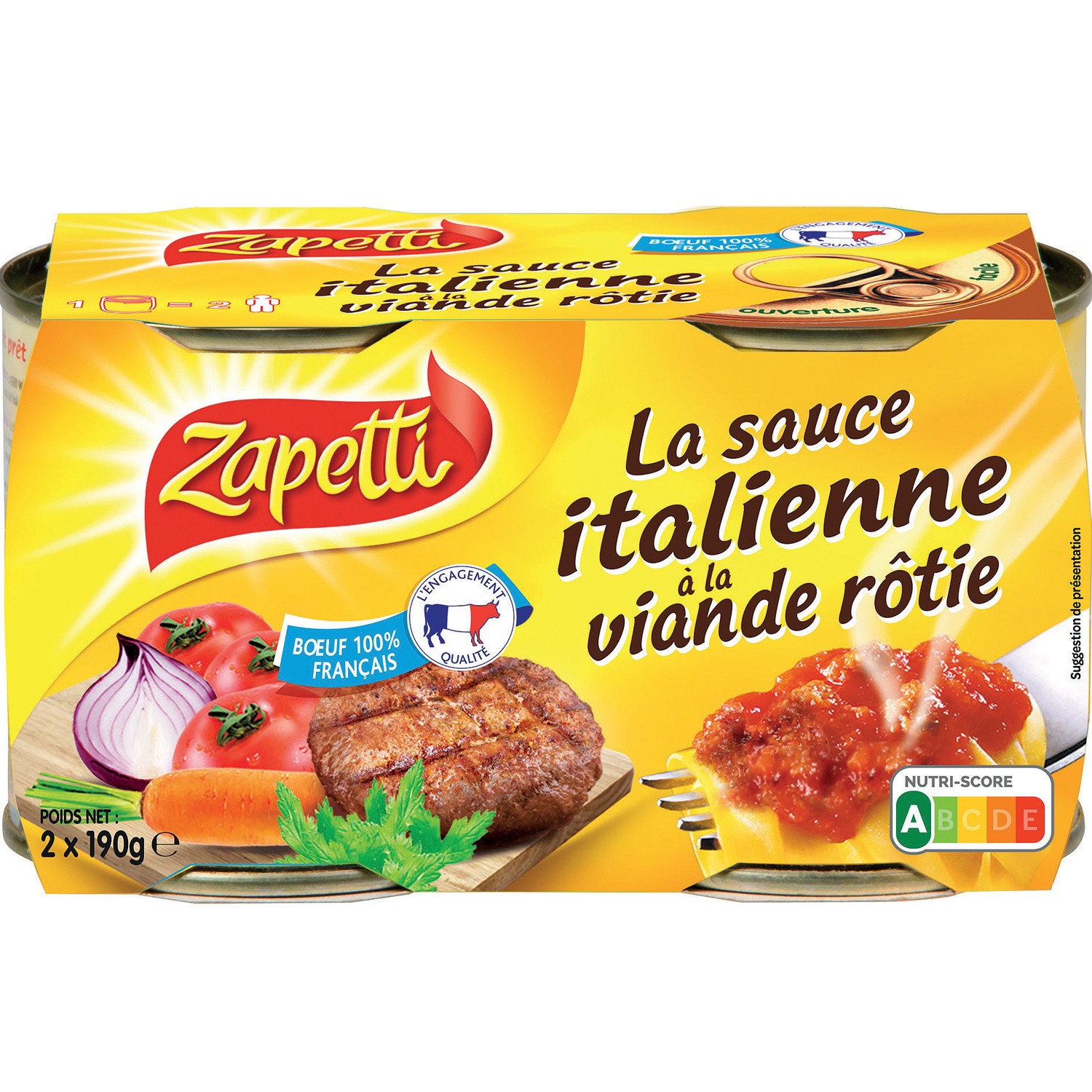 sauce à la tomate à la viande bovine et aux légumes. Ingrédients : Purée de tomate mi-réduite 60% - viande bovine 14% (origine : UE)...